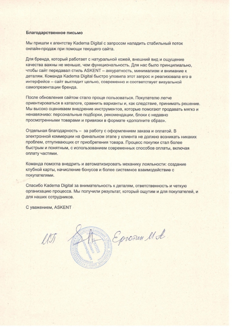 Мы обратились в Kadema Digital, чтобы сделать наш сайт стабильным каналом онлайн-продаж. Пользоваться сайтом, оформлять заказ и проводить оплату стало заметно проще. Отдельно благодарим за автоматизацию программы лояльности с клубной картой и бонусами.