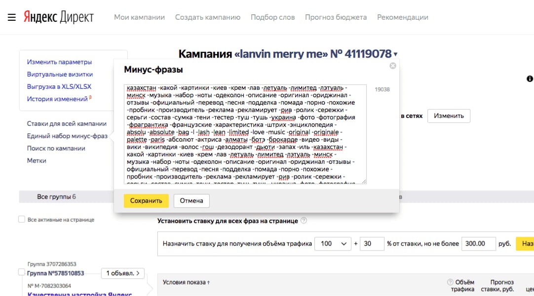 - Чистка кампаний от мусорного трафика – добавление минус слов